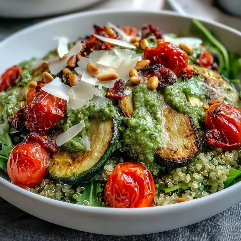 Save The smell of roasting vegetables always pulls me back into the kitchen, no matter what else is happening. I started making this bowl on a Tuesday night when I had a bunch of arugula wilting in the crisper and zero energy for anything complicated. Tossing it into pesto felt like cheating in the best way. The quinoa soaked up that sharp, lemony green sauce, and suddenly dinner felt intentional. It's been my go-to ever since.