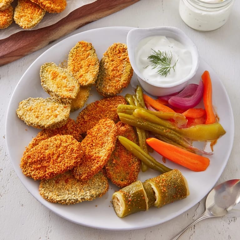 Save A tangy, crunchy feast featuring crispy fried pickles, a variety of pickled vegetables, and a playful twist with pickled-wrapped bites: perfect for true pickle enthusiasts.