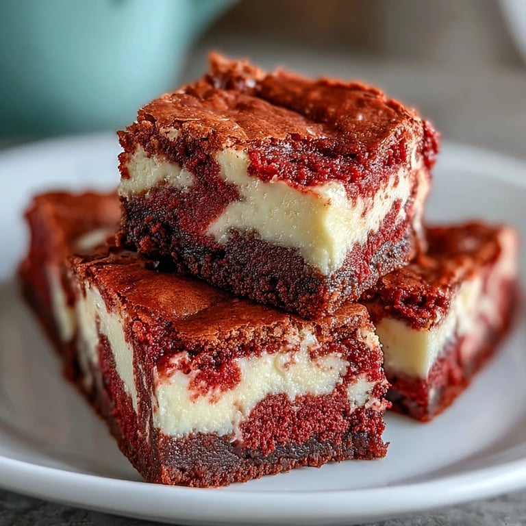 These brownies are best served chilled. The refrigeration time allows the cheesecake layer to set firmly, making it much easier to cut into neat, clean squares. Serve them on a white platter to make the vibrant red color pop, perhaps with a side of fresh berries.