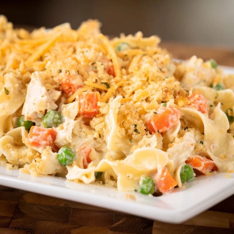 Save A comforting casserole combining tender noodles, creamy chicken soup, and melty cheese, baked to golden perfection for an easy and satisfying family meal.