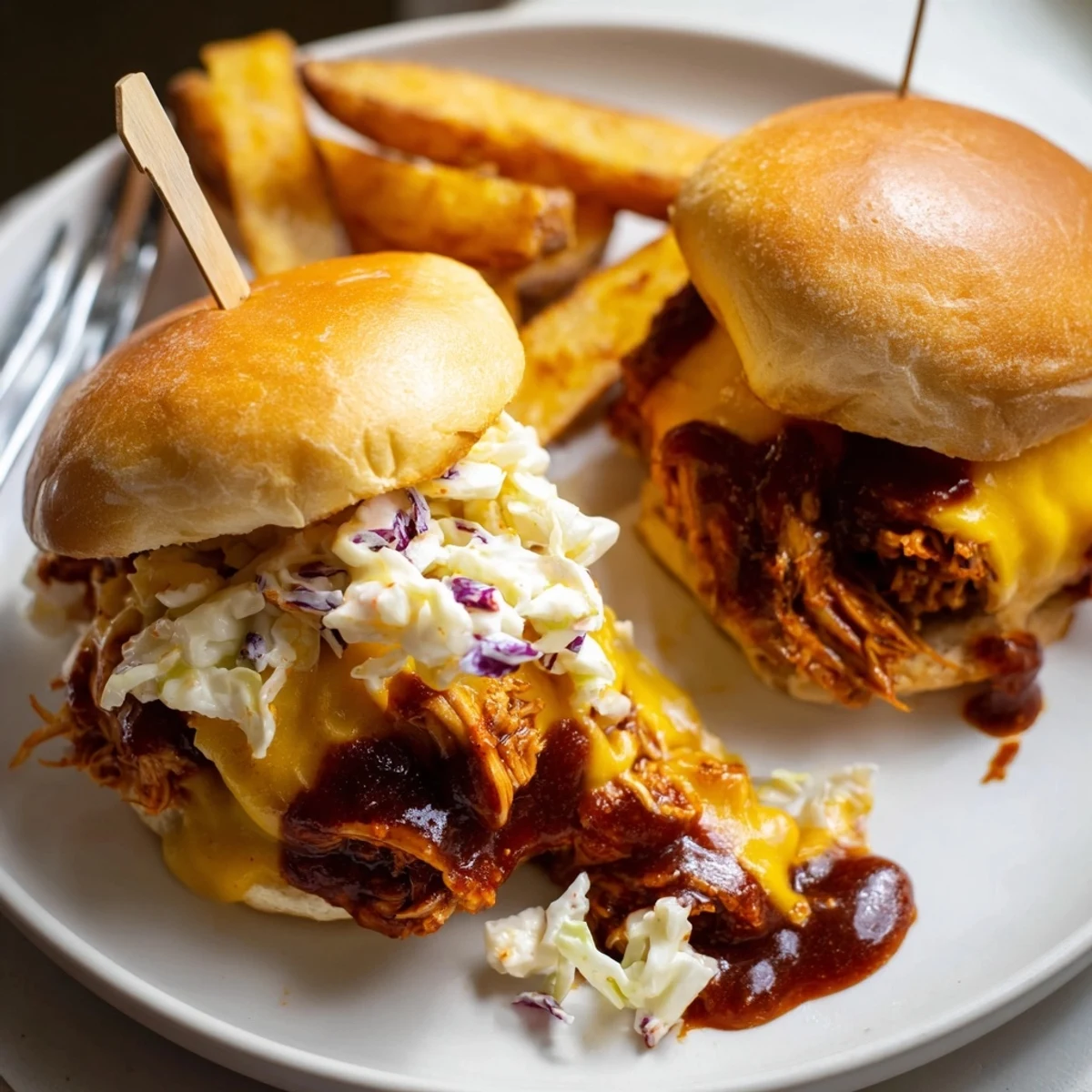 Save Enjoy the unbeatable comfort of BBQ Chicken Sliders paired with perfectly crispy golden fries. This easy-to-make American classic features juicy shredded barbecue chicken nestled inside soft slider buns, topped with melty cheddar cheese and crunchy coleslaw. It’s an ideal dish for casual gatherings or a family dinner, bringing casual flavor and satisfying textures to your table in less than an hour.
