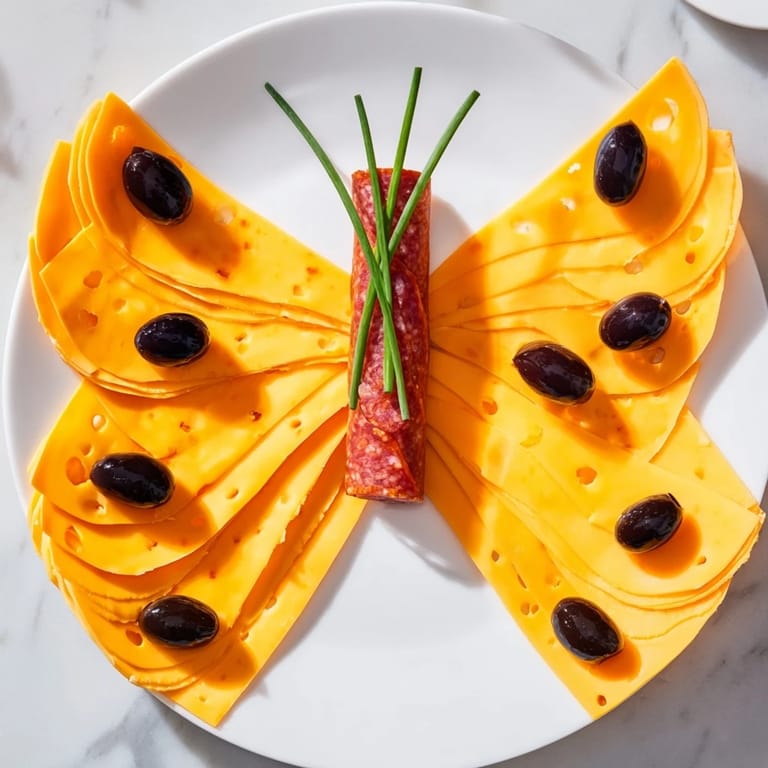 This playful platter arranges sliced orange cheddar cheese into butterfly-shaped wings, accented with black olive patterns and centered with a salami body. Quick and easy to prepare in 15 minutes, it adds a fun touch to gatherings or kid-friendly snacks. Garnish with chives or pretzel sticks for antennae detail. Variations include adding colorful cheeses or bell peppers, and options for turkey or vegetarian salami. Serve immediately or chilled.