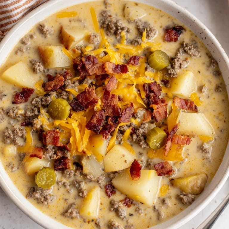 Save A cozy, hearty soup that tastes just like your favorite cheeseburger—loaded with savory beef, melty cheddar, tender potatoes, and smoky bacon. The crockpot makes this easy and perfect for busy weeknights. Top with pickles or tomatoes for a classic cheeseburger finish.