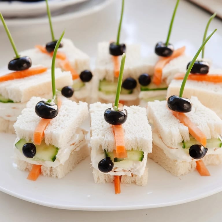 - Insert two short pieces of chive as antennae into each sandwich.