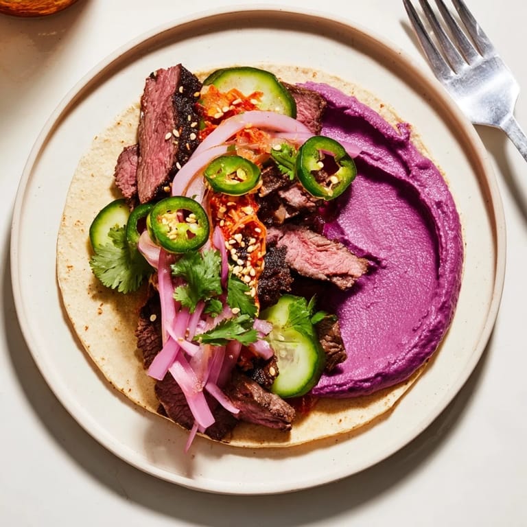 Save A vibrant flavor-packed recipe blending inspirations from street food around the world—think Korean bulgogi tacos Filipino ube crema and zesty Mexican toppings. Perfect for a fun customizable meal!