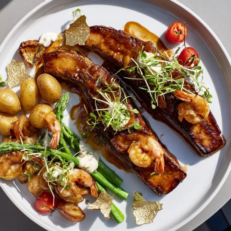 Save An opulent platter featuring premium meats, seafood, and golden accents, perfect for a celebratory occasion or a luxurious dinner party.
