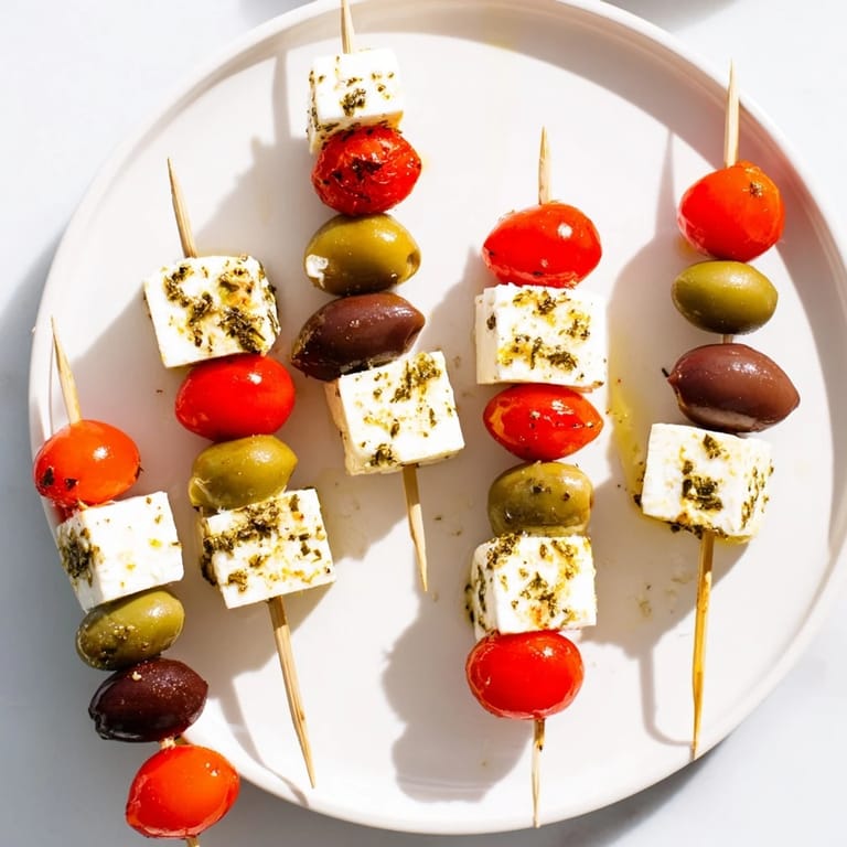 - Cheese and Vegetables: 200 g feta cheese, cut into 16 cubes, 16 cherry tomatoes, 16 pitted kalamata olives, 16 pitted green olives
