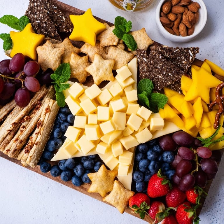- Arrange mango stars and blueberries around the cheese star for vibrant color Layer grapes and strawberries along the tail adding dried apricots for sweetness