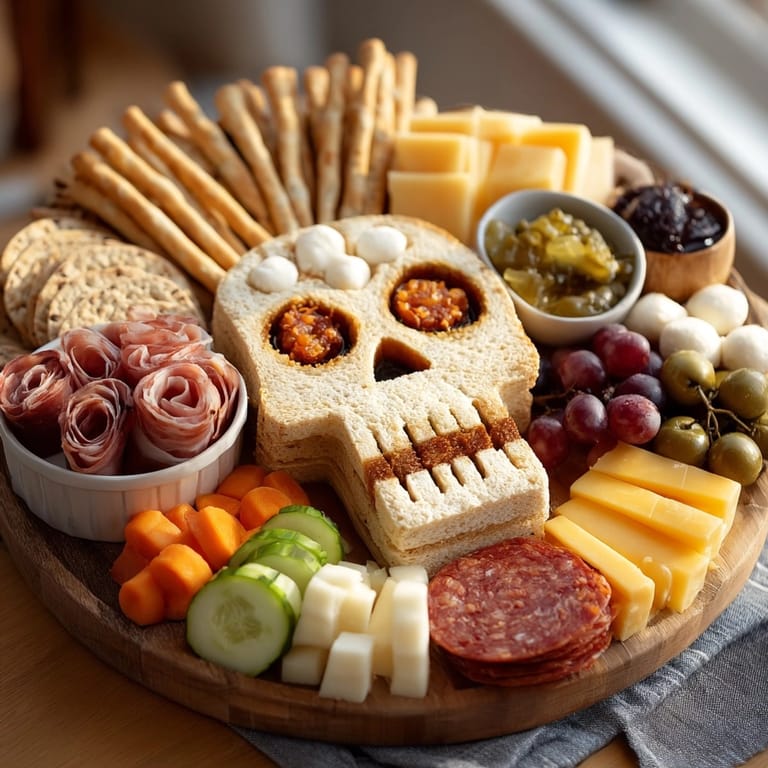 This playful board features an assortment of meats, cheeses, crackers, fruits, and accompaniments arranged into a skeleton shape for Halloween gatherings. The vibrant display includes brie and mozzarella for bones, various sliced and rolled charcuterie for the body, and grapes with olives for expressive details. Fresh vegetables and breads add color and texture, while condiments complete the spread. It’s quick to assemble, visually striking, and perfect as a festive centerpiece. The board can be adapted for dietary needs and pairs well with wine or sparkling water for a crowd-pleasing Halloween appetizer.