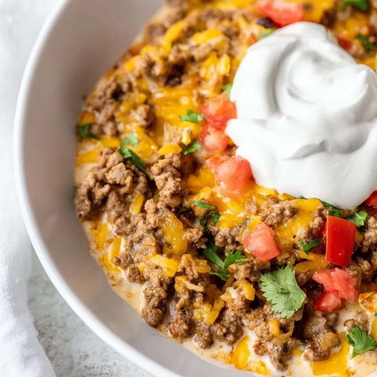 Save A rich, ultra-creamy dip combining savory ground beef, zesty tomatoes, black beans, and melty cheddar, all gently simmered in your slow cooker. Finished with a swirl of sour cream and a sprinkle of fresh cilantro, it's the perfect party snack warm, hearty, and irresistibly scoopable with tortilla chips.