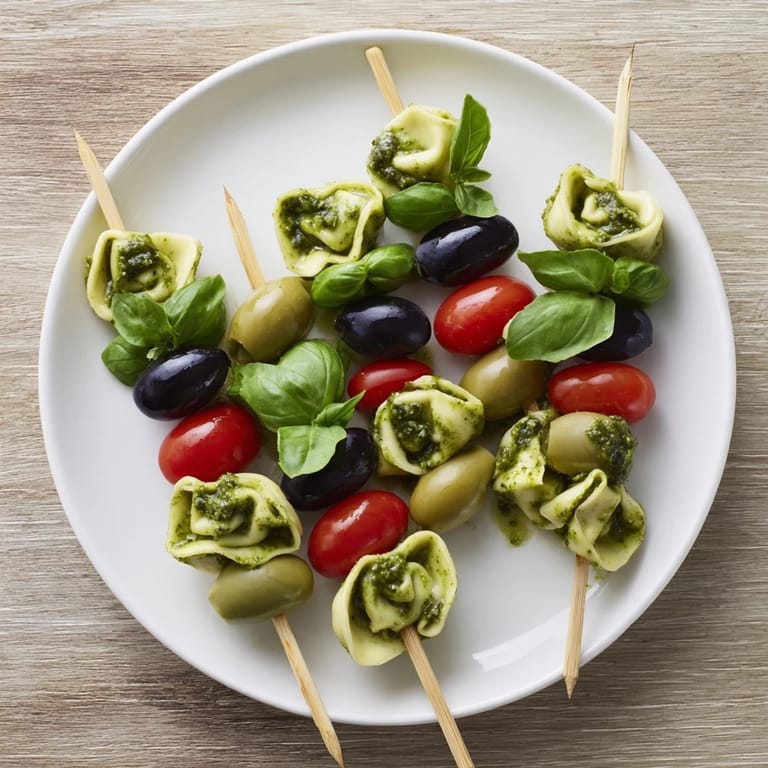 Save A vibrant and crowd-pleasing appetizer featuring tender tortellini, aromatic pesto, and briny olives, all threaded onto skewers for easy serving.